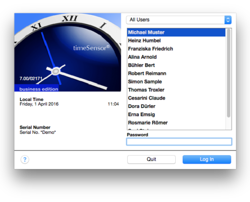 The classic login window of timeSensor LEGAL is not optimal in terms of data protection, since it displays all users, groups and entities. This may not be a problem for a small law practice in the protected environment of a local network, but it can be an issue if you move the database to the cloud or if your database is accessible via Wi-Fi.